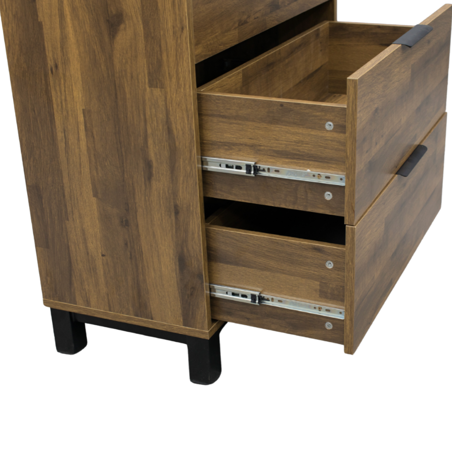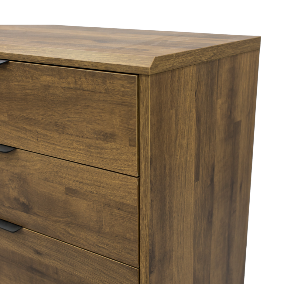 Bring a touch of modern industrial style into your bedroom with the Corsi Tallboy, a sleek and functional storage piece that blends warmth and practicality. Featuring a rich wood-look finish contrasted by matte black metal accents, the Corsi Tallboy is designed to complement a wide range of interior styles, from contemporary to rustic.