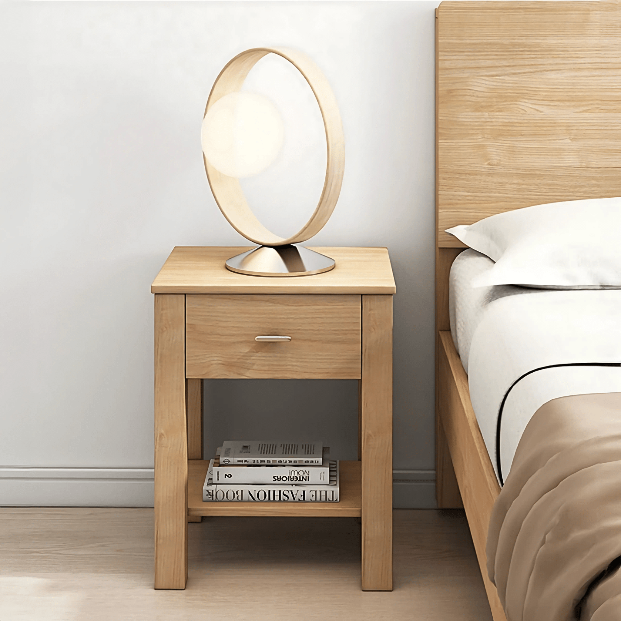The Modena Bedside Table combines style and practicality in a compact design, perfect for small bedrooms or versatile spaces. Featuring a lower open shelf for books or décor, copper handle accents, and eco-friendly rubber wood legs, it blends durability with modern elegance.