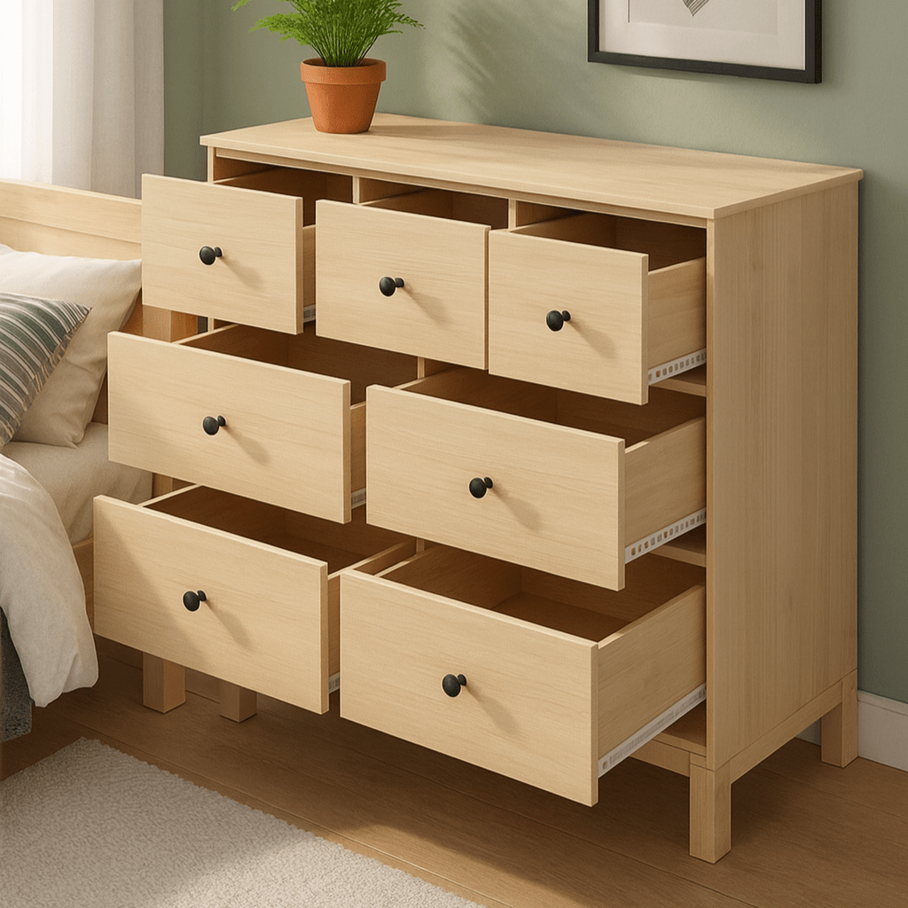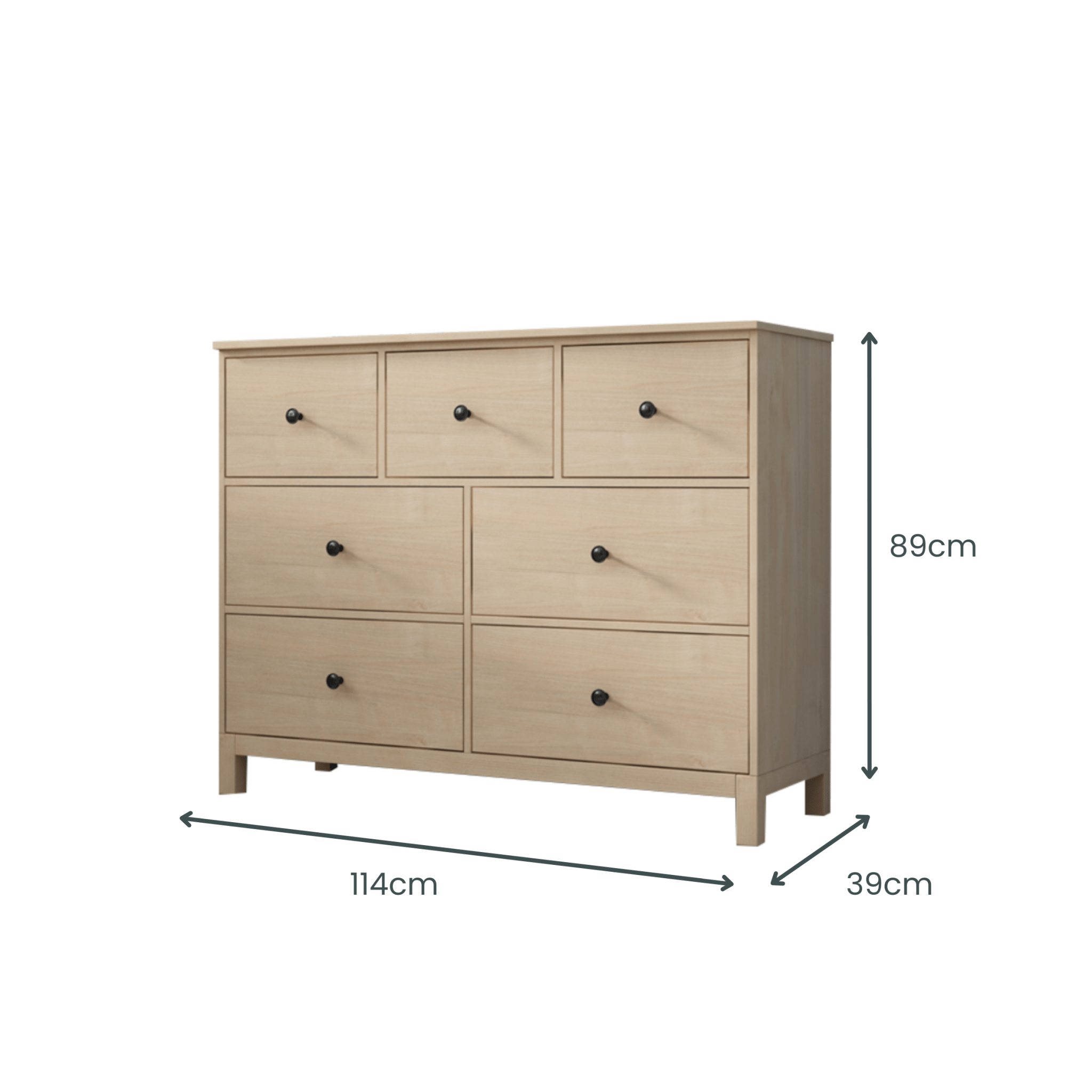 The Modica Lowboy combines sleek modern design with practical storage, featuring seven spacious drawers to keep clothes and essentials neatly organised. Built from durable materials with smooth finishes, it’s sturdy, easy to assemble, and simple to maintain. Its minimal style blends effortlessly with any décor, making it a versatile addition to your home.