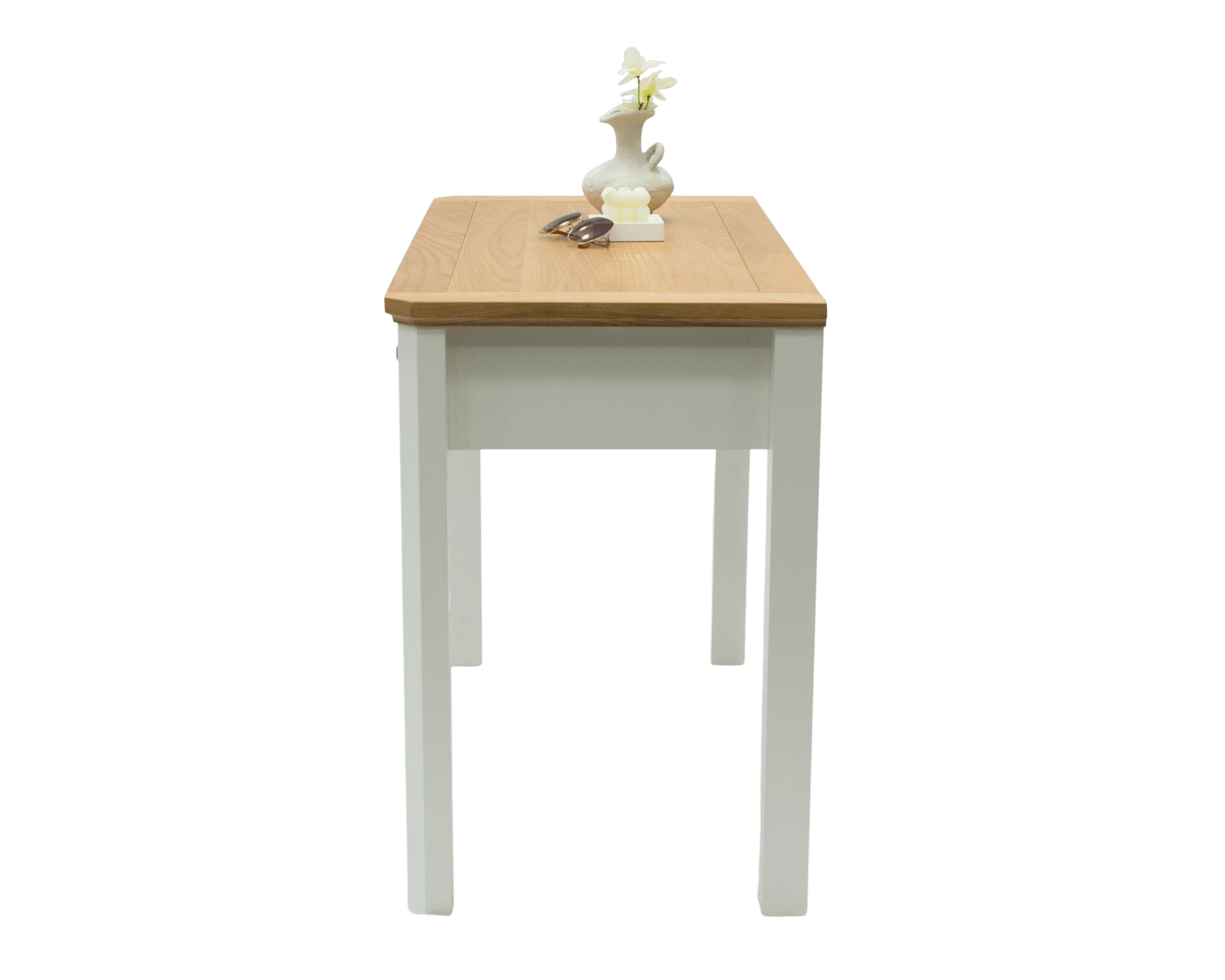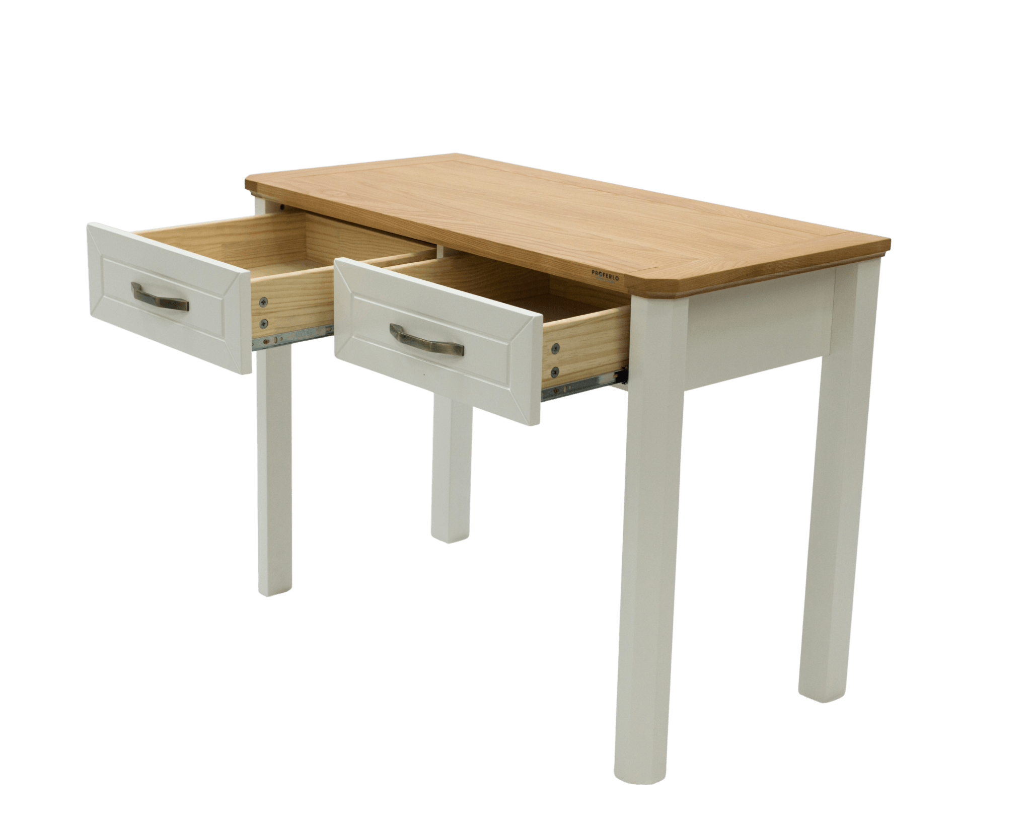 The Stoven 2 Drawer Dressing Table blends timeless style with everyday practicality. Made from a combination of solid wood, particleboard, and metal, it offers durability while maintaining a sleek, elegant look. With two spacious drawers and a natural wood top, this dressing table is perfect for storing your daily essentials and elevating any bedroom or dressing space.